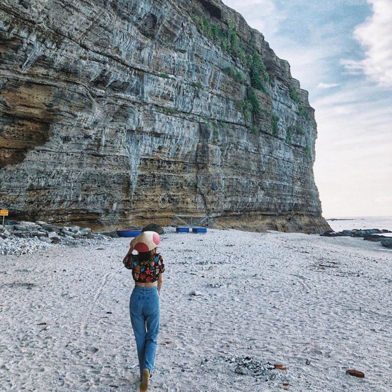 Vẻ đẹp hoang sơ, bí ẩn đã thu hút giới trẻ tới đây check-in. Khác với hình thù uốn lượn của 2 vách đá trên đảo Phú Quý, Lý Sơn, chốn sống ảo này bằng phẳng với những đường kẻ dọc đều nhau, tựa như bức tường màu xám khổng lồ nhân tạo. Du khách thường đứng dưới vách đá để chụp ảnh.
