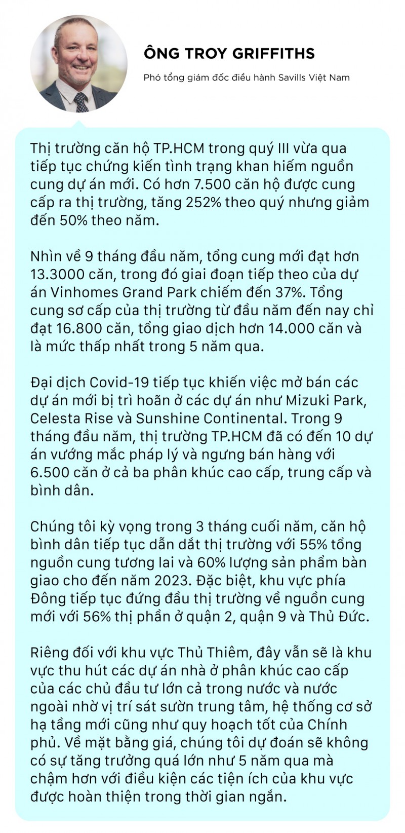 "Tình trạng này diễn ra bởi 2 lý do, thứ nhất là nguồn cung thị trường khan hiếm, thứ hai là đề án thành lập Thành phố Thủ Đức tiếp tục là một tín hiệu kích thích giá nhà khu Đông. Tuy nhiên, khu vực giá cao mà vẫn có những thông tin tốt là một hiện tượng khá lạ lẫm", ông Trần Khánh Quang nói với Zing.