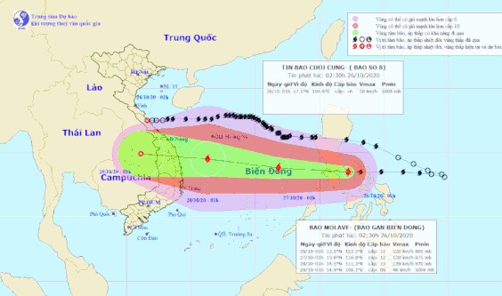 Trung tâm Dự báo Khí tượng Thủy văn Quốc gia cho biết, sáng nay (26/10), bão Molave đã đi vào Biển Đông và trở thành cơn bão số 9 trong năm 2020.