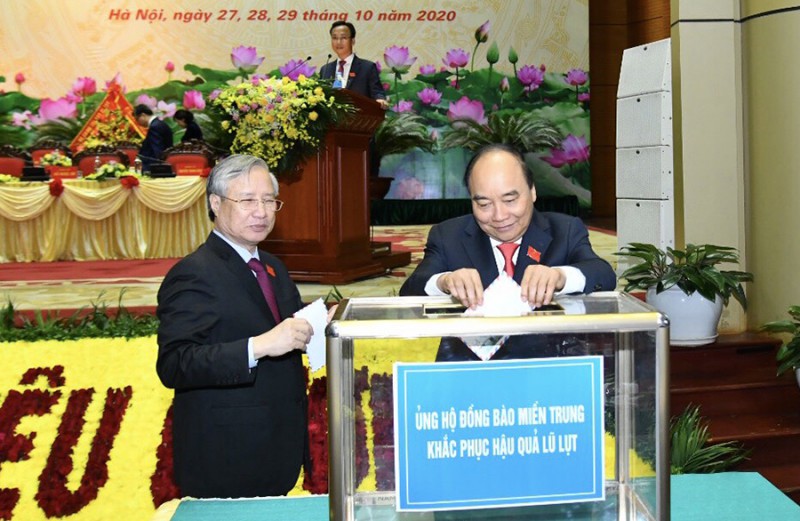 Thủ tướng Nguyễn Xuân Phúc và Thường trực Ban Bí thư Trần Quốc Vượng tham dự Đại hội và quyên góp ủng hộ đồng bào miền Trung khắc phục hậu quả lũ lụt (Ảnh: VGP)
