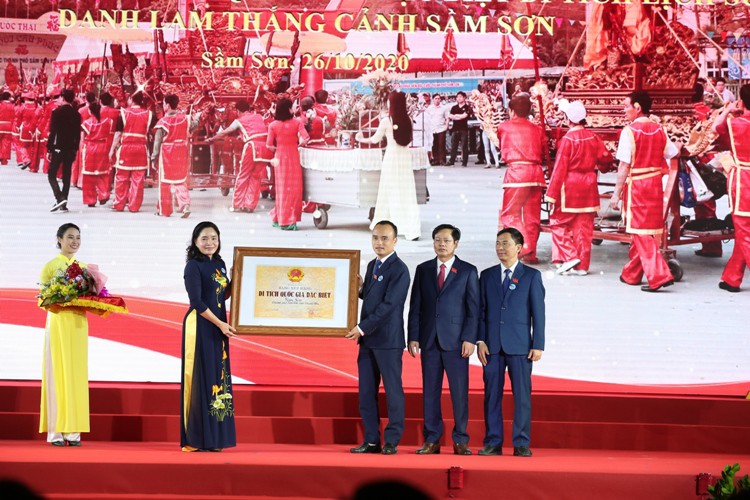 Thứ trưởng Bộ VHTTDL Trịnh Thị Thủy trao bằng xếp hạng Quốc gia đặc biệt Di tích lịch sử và danh lam thắng cảnh Sầm Sơn cho Đảng bộ, chính quyền và nhân dân Tp. Sầm Sơn