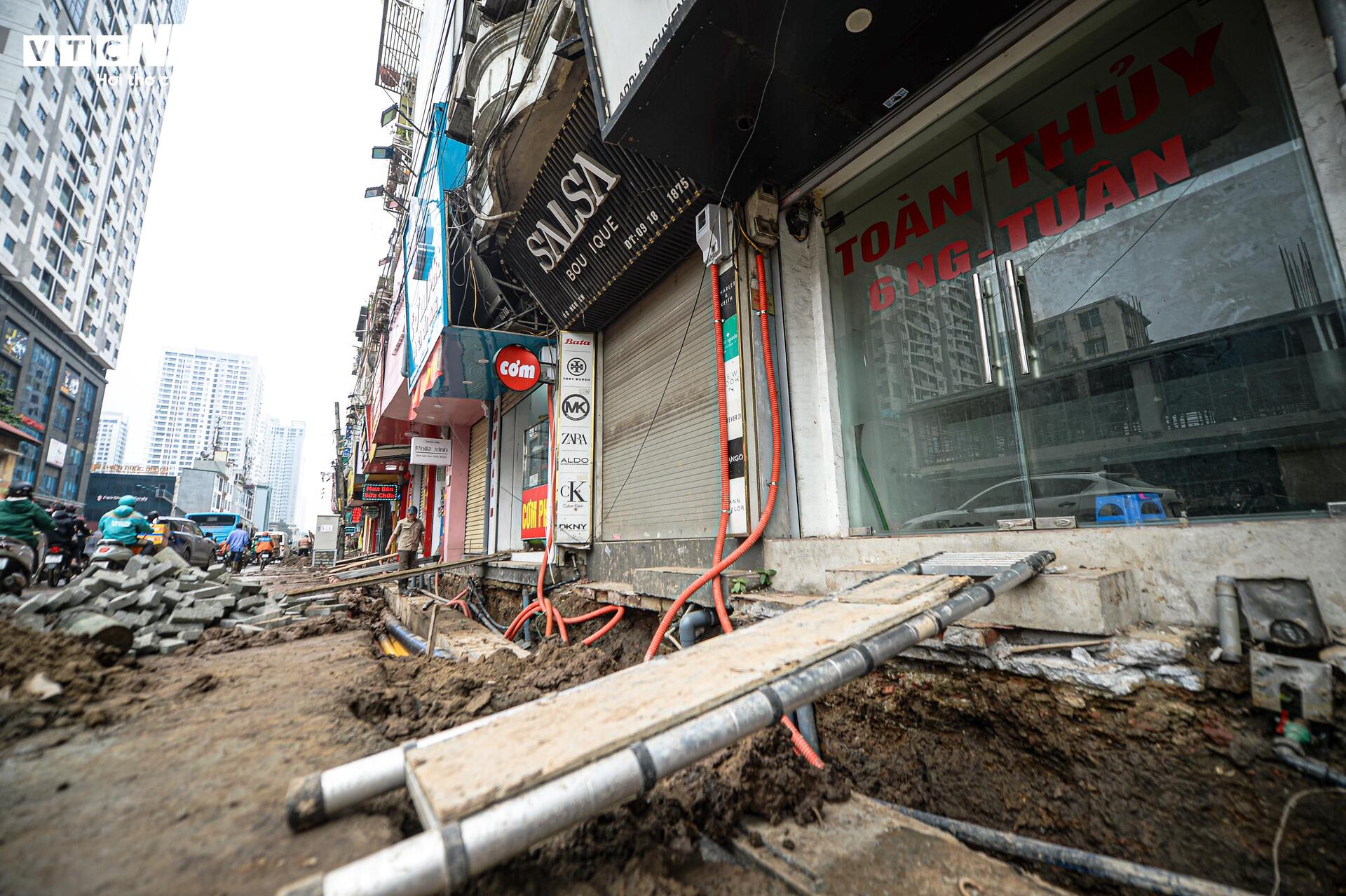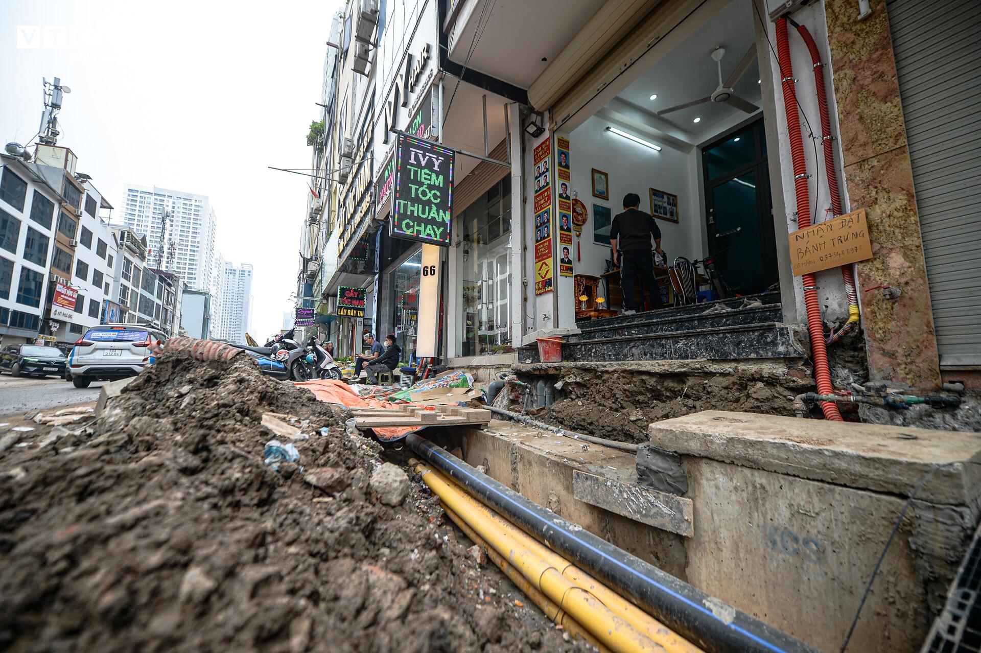 Không chỉ việc đi lại bị ảnh hưởng, hoạt động kinh doanh của các hộ dân dọc tuyến cũng gặp khó. Bùn đất bám vào giày dép khách ra vào khiến nhiều cửa hàng phải lau dọn liên tục. Có nơi khách ngại dừng xe do không còn khoảng trống trước cửa.