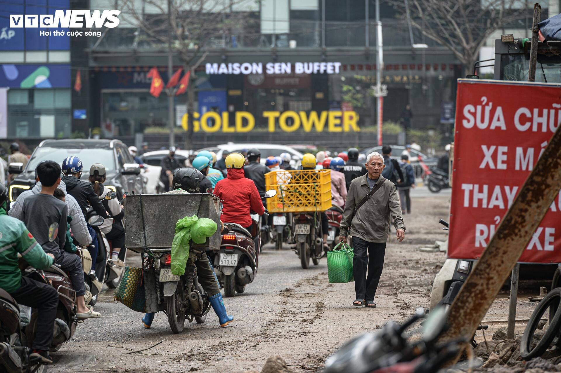 Hai bên tuyến đường tập trung nhiều chung cư và trường học nên lưu lượng người qua lại luôn đông. Trong điều kiện mặt đường lầy lội, nhiều phụ huynh phải dắt tay hoặc bế con qua đoạn bùn để vào trường.