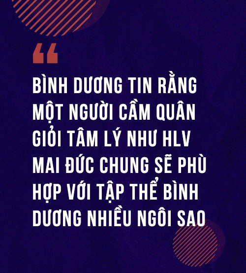 Bối cảnh ấy khiến trưởng đoàn CLB Bình Dương Trần Văn Đường phải bay ra Hà Nội, tìm gặp HLV Mai Đức Chung, người khi ấy vừa nghỉ hưu. Bình Dương tin một người cầm quân giỏi tâm lý, biết cách xoa dịu những cá tính mạnh sẽ là nhân vật phù hợp với đội bóng có nhiều ngôi sao như Bình Dương.