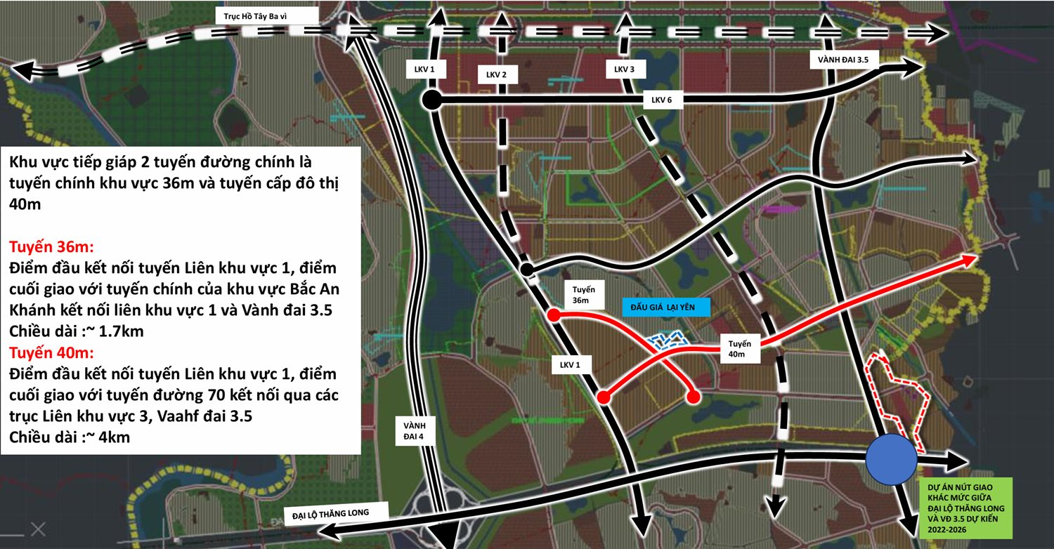 Đường 36m dài 1,7km có điểm đầu kết nối tuyến Liên khu vực 1. Tuyến đường này cắt ngang tuyến 40m và có điểm cuối giao với tuyến chính của khu vực Bắc An Khánh kết nối liên khu vực 1 và Vành đai 3.5.