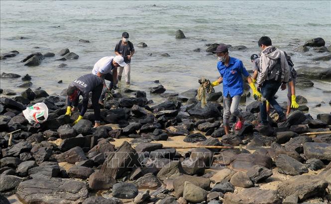 | Dọn rác tại Hòn Yến. Ảnh TTXVN |