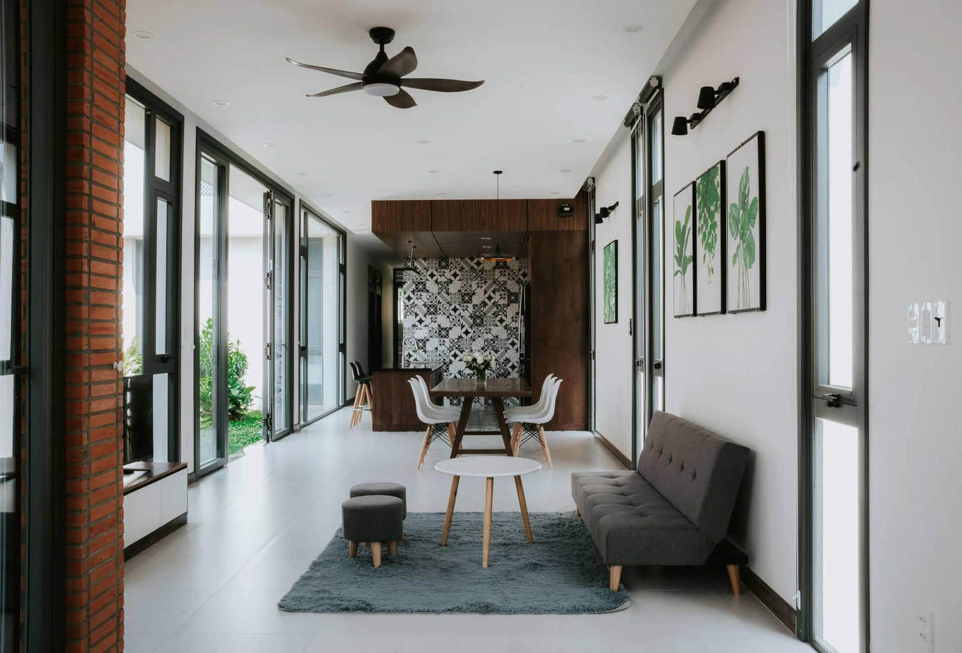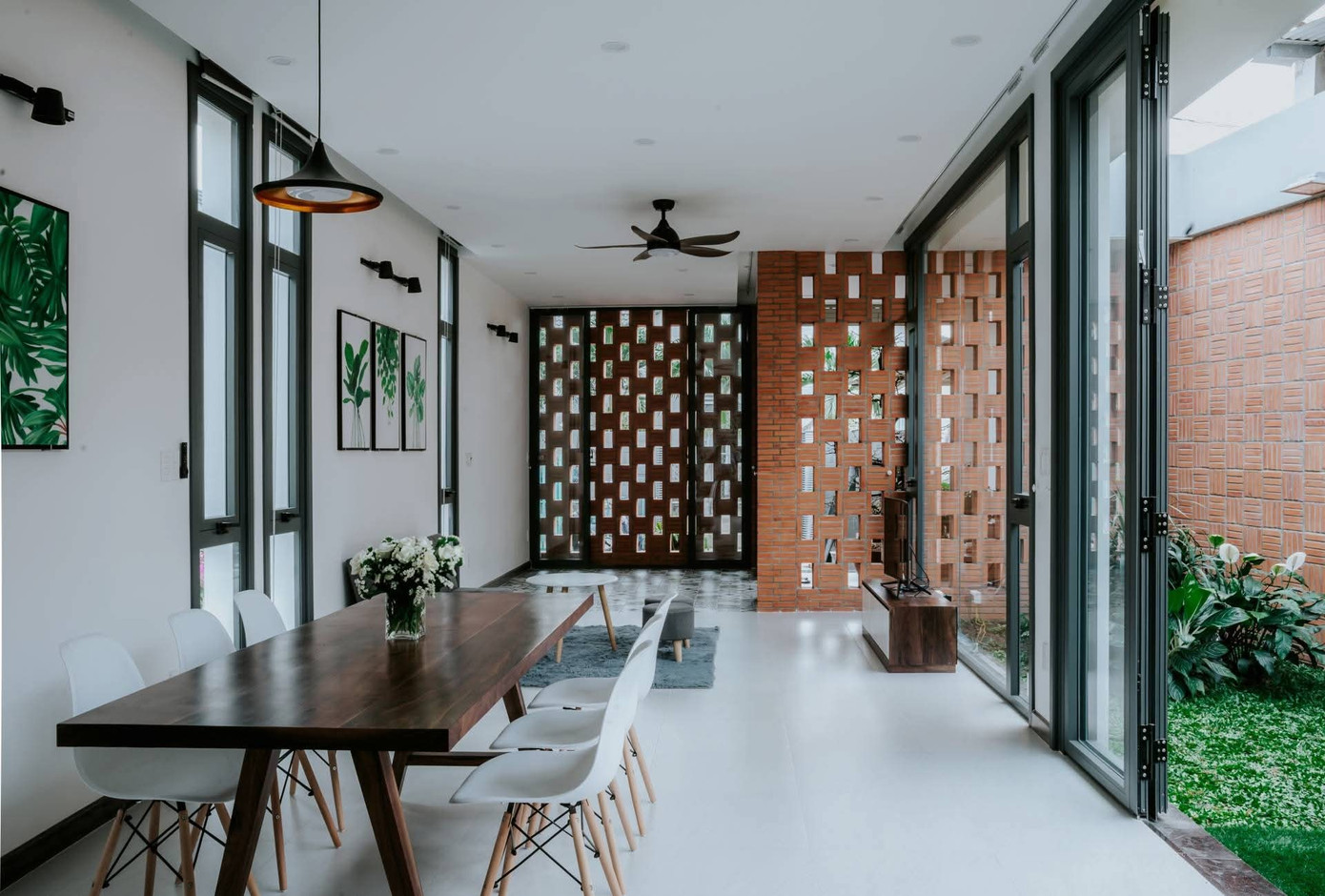 Tất cả các không gian đều được mở ra khu vườn bên ngoài qua thiết kế cửa kính và các ô gió xây từ gạch đỏ.