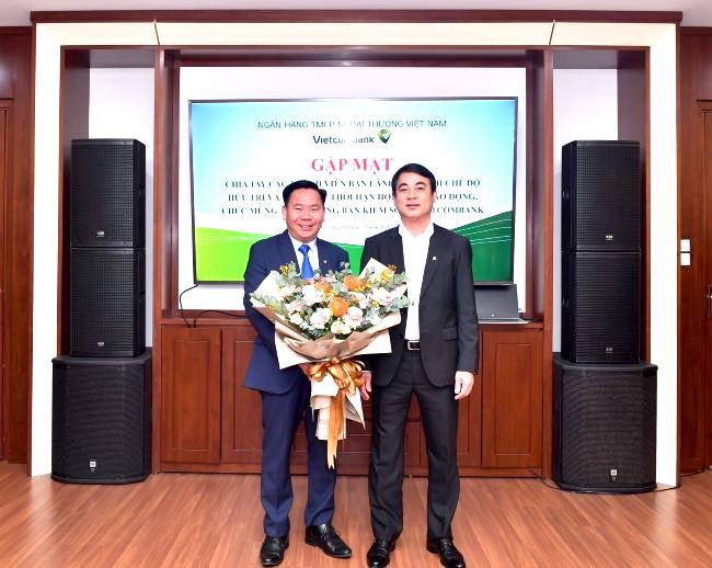 | Ông Nghiêm Xuân Thành – Chủ tịch Hội đồng quản trị Vietcombank (bên phải) chúc mừng tân Trưởng ban Kiểm soát Lại Hữu Phước. |